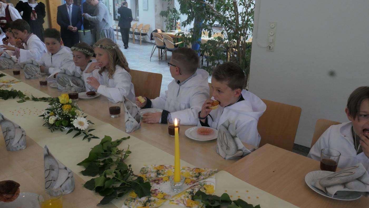Am Sonntag war es dann soweit: Unsere Kinder feierten gemeinsam mit Eltern, Geschwistern und Freunden einen berührenden Gottesdienst und durften zum ersten mal an der Kommunion teilnehmen. Ein Fest, das nur durch die Hilfe vieler Hände stattfinden konnte. Hier sei Hochwürden Pfarrer Frühauf, unserem Religionslehrer Herrn Schroll, seiner Kollegin Frau Stöger, dem Chor mit Lisi Sternat und allen Eltern gedankt!
